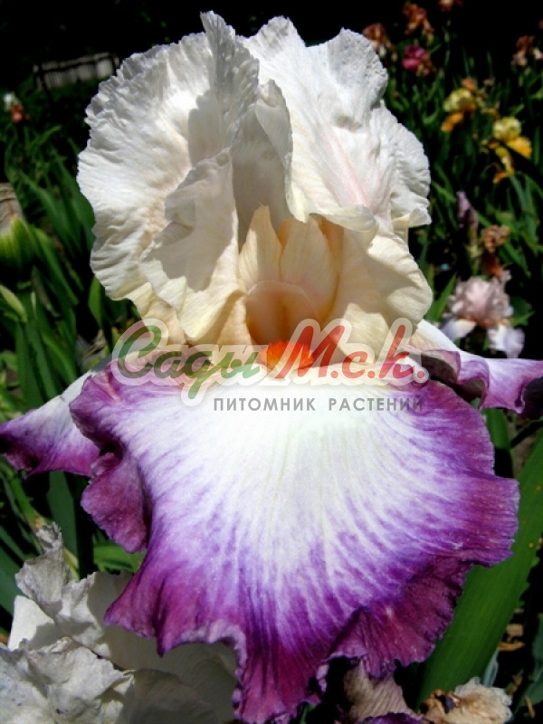 Рассада ириса Ring Around Rosie обладают редким уникальным сочетанием цветов. Нижние доли (фолы) – это пестрая смесь из белого, фиолетово-сливового и оранжевого цветов, которые плавно проникают друг в друга, благодаря россыпи разноцветных точек. Оранжевая кайма красиво гофрирована. Верхние доли (стандарты) окрашены в чистый белый, молочный цвет и украшены тонкой лимонной гофрированной каймой. Бородки - ярко-желтые, их оттенок полностью совпадает с окраской оборки на фолах. Расцветка уникальна и не имеет аналогов в других сортах.